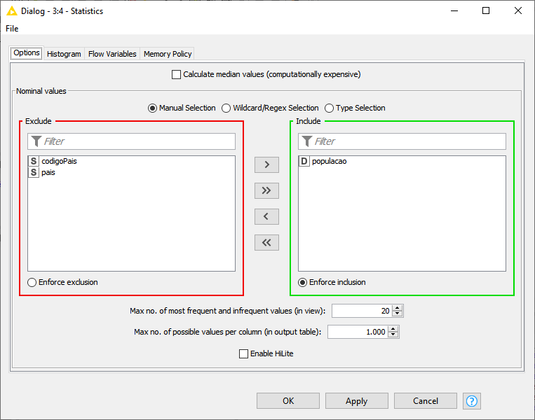 Vamos deixar na caixa Include apenas a coluna população. A seguir clique em Apply e OK. Clique no botão de execução do fluxo no KNIME e veja que o nosso node passou a ficar com o sinal verde. Clique com o botão da direita sobre ele e a seguir localize a opção Statistic Table no menu apresentado. Clique nesta opção e veja os dados do node baseado no que foi coletado de dados da query: