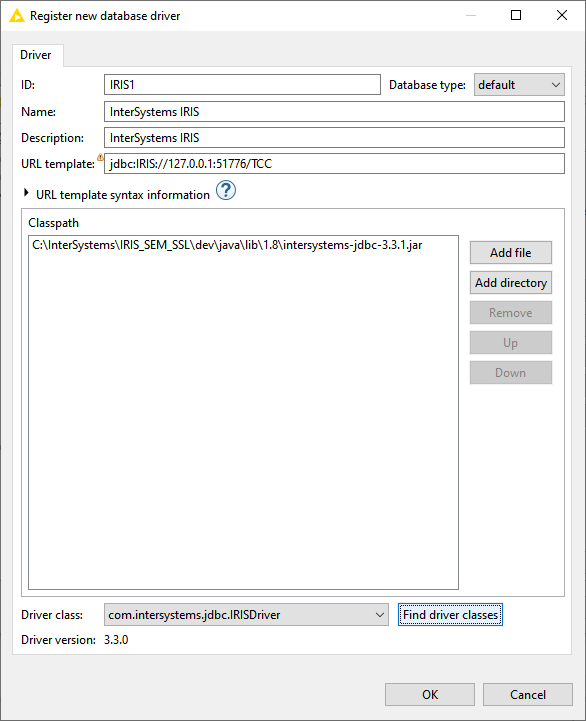 Clique em Add e preencha a tela com as informações de acesso ao driver JDBC do IRIS: