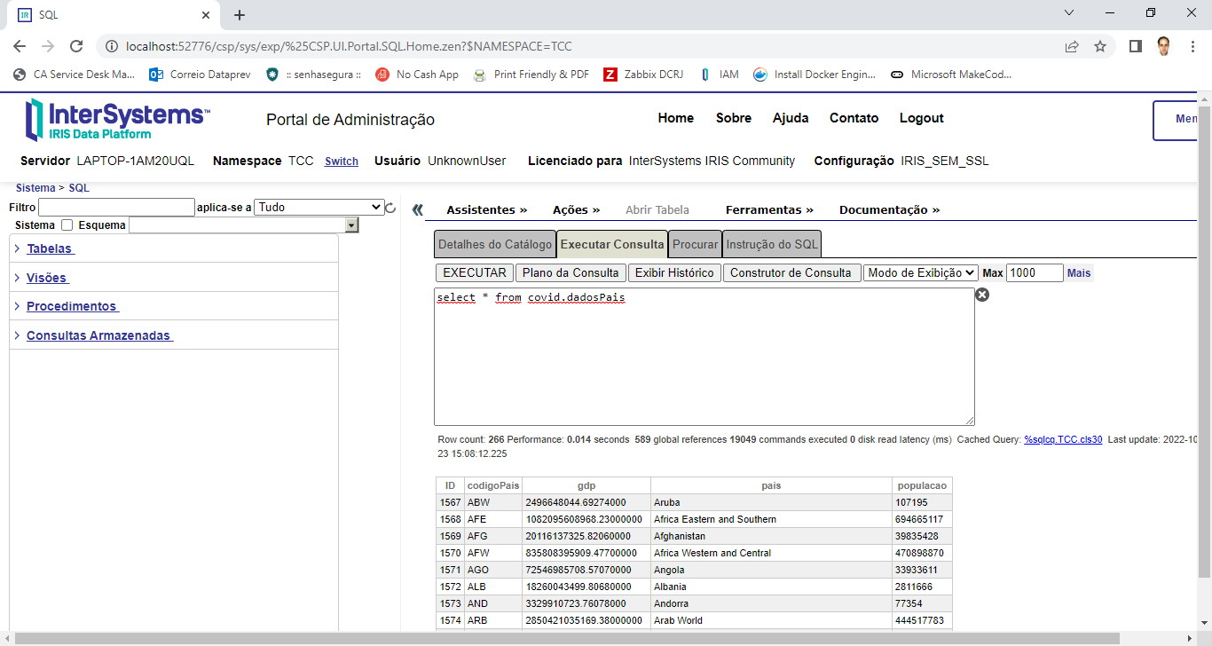 Clique em OK na tela dos dados e depois em Apply and Close na tela de Databases. Pronto. O KNIME já está configurado e conhecendo como acessar o IRIS. Agora vamos consumir os dados de uma tabela do IRIS. A URL que informamos aponta para o namespace TCC no servidor IRIS. Nele temos a tabela que iremos consumir: