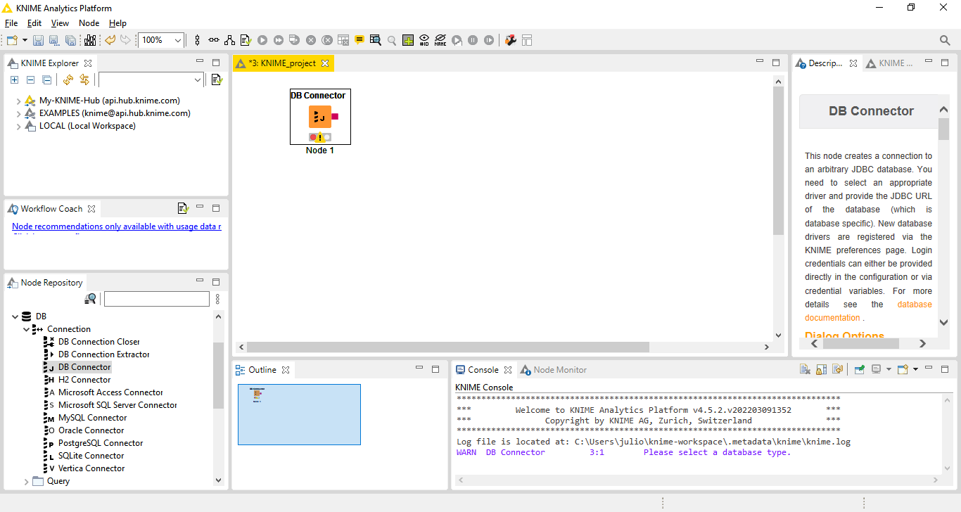 Clique em Next e Finish. Será apresentada a área onde os nodes do KNIME serão colocados e posteriormente configurados. Vamos começar colocando o node de conexão ao banco de dados. Clique na treeview da área de Node Repository em DB->Connection e arraste o node DB Connector para a área do workflow: