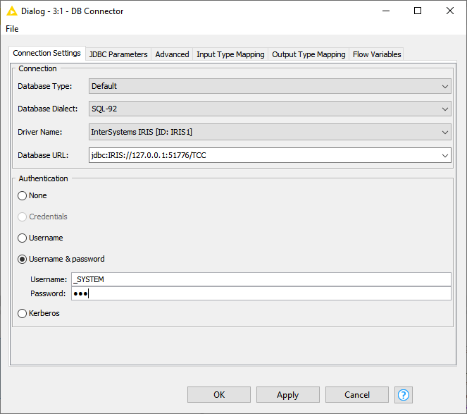 Preencha os dados conforme a tela abaixo (exemplo para o IRIS local no mesmo servidor que o KNIME);