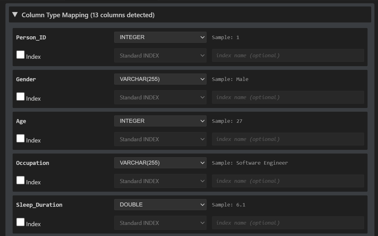 O resultado da análise é mostrado na seção "Column Type Mapping" (Mapeamento de Tipo de Coluna) na parte inferior da webview de importação.