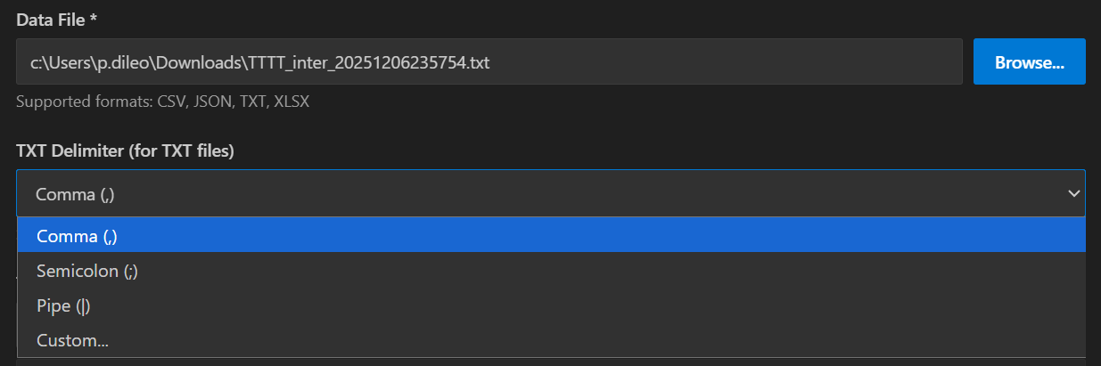 Ao importar arquivos TXT, a extensão permite que você especifique um delimitador personalizado para garantir que o arquivo seja analisado corretamente. Isso é especialmente útil ao trabalhar com separadores não convencionais, como pipes (|), ponto e vírgula (;), tabulações ou delimitadores de múltiplos caracteres. Selecionar o delimitador correto garante a detecção adequada das colunas e evita dados desalinhados ou corrompidos durante o processo de importação.