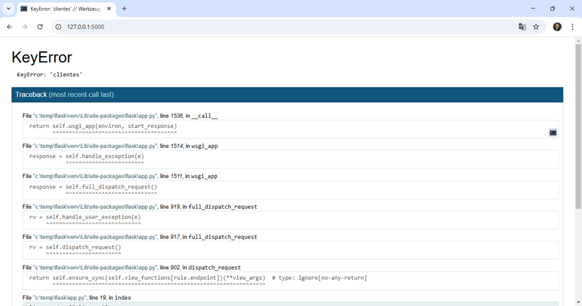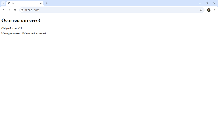 Vamos reiniciar a aplicação Flask e mais uma vez vamos chamar a API diversas vezes. Desta vez vamos receber uma tela de erro tratado: