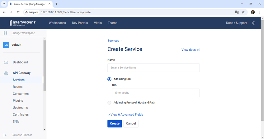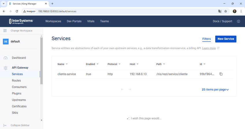 Uma vez ativado o IAM vamos abrir a interface de administração para criar o serviço, rota e plugin necessários. Para isso no navegador acessamos o servidor na porta 8002: