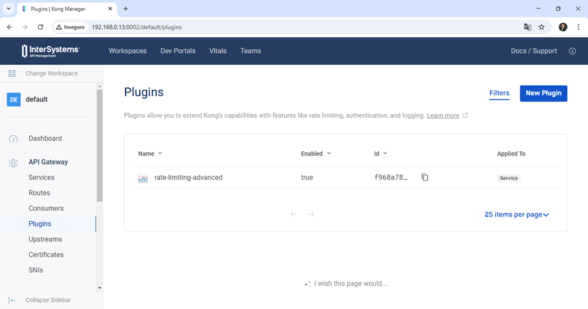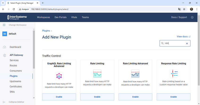 Agora vamos criar o plugin de rate Limiting. Este plugin limita o número de solicitações que um usuário pode fazer em um determinado período de tempo. Para isso volte ao menu lateral e clique em Plugins e na sequencia em New Plugin. Na caixa de pesquisa digite Rate e veja os plugins listados: