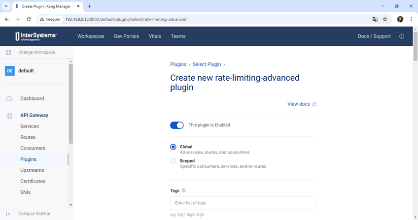 Selecione o plugin Rate Limiting Advanced. Será a presentada a tela de configuração do plugin: