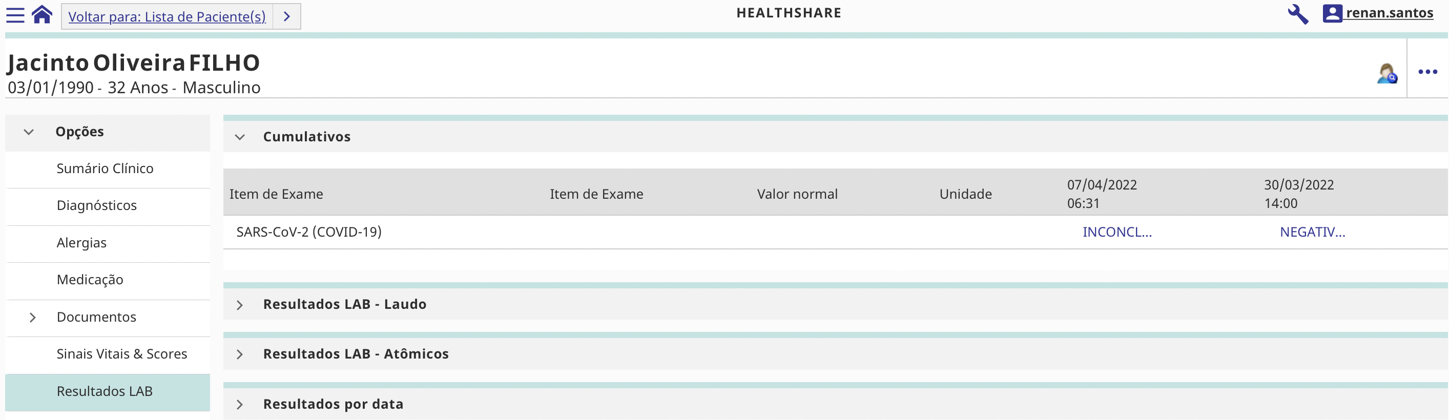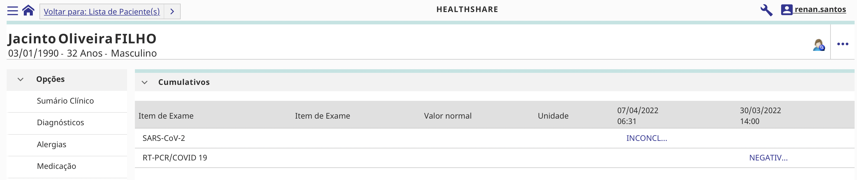 No HealthShare de início, essas informações são apresentadas de forma não-agrupada: