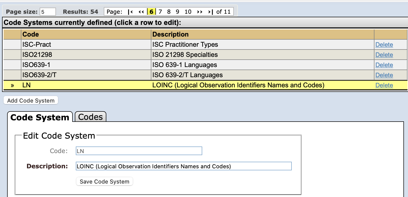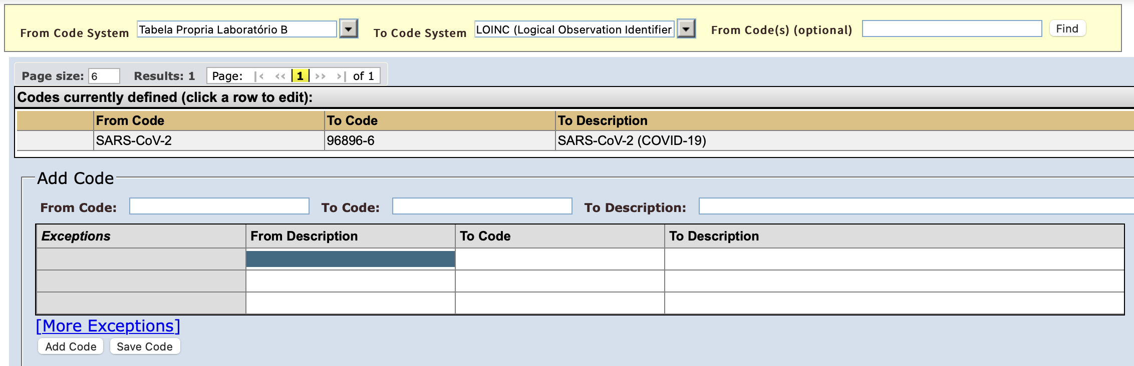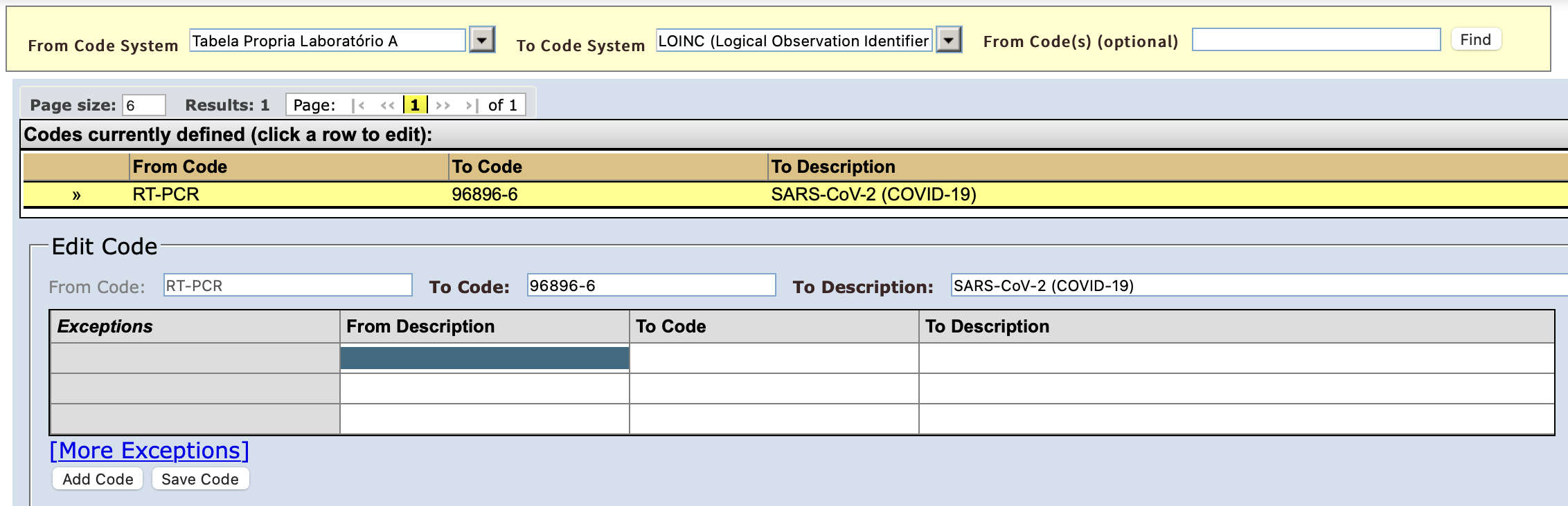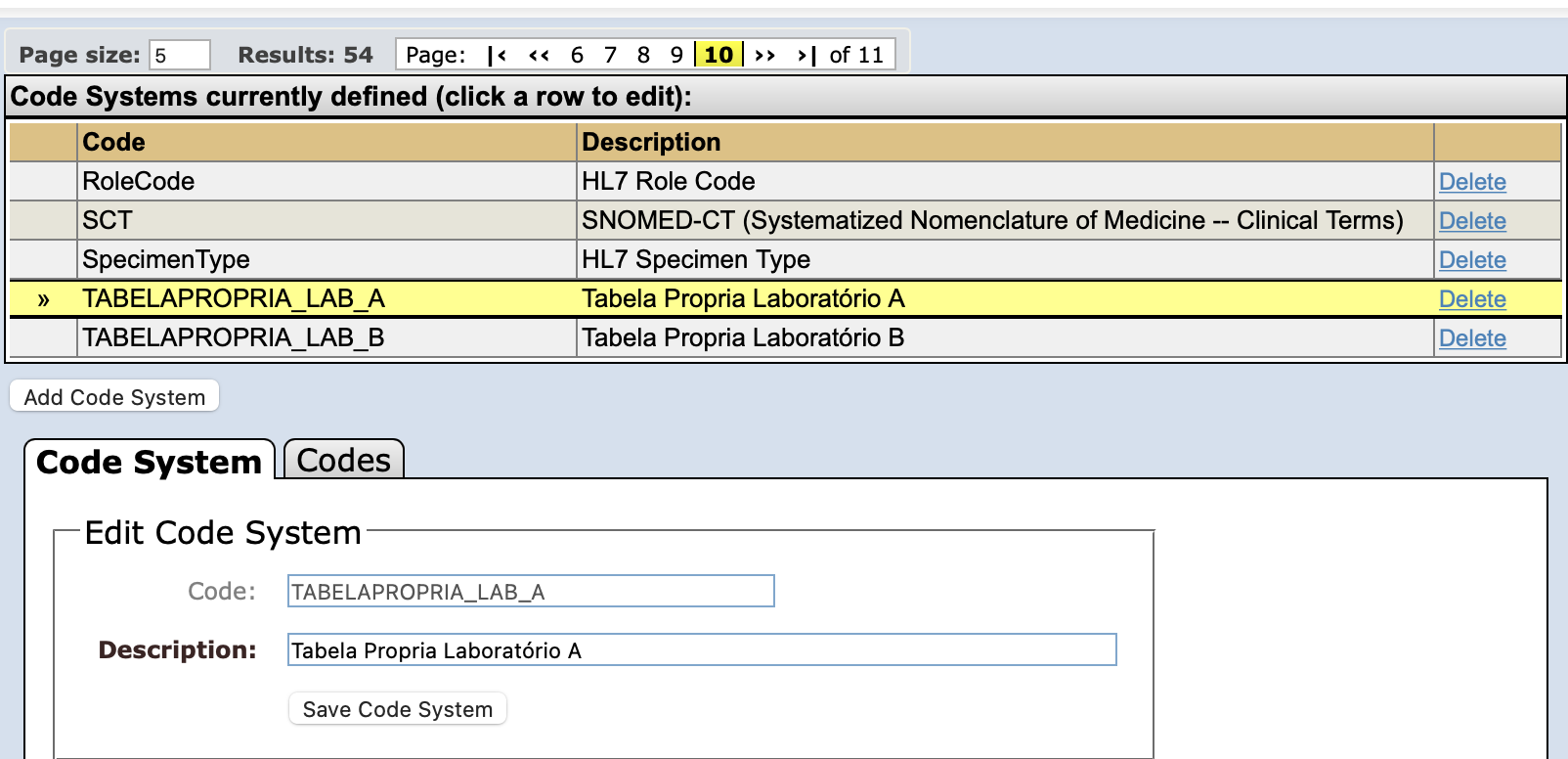 Coding Systems de origem (próprias de cada laboratório, no exemplo):