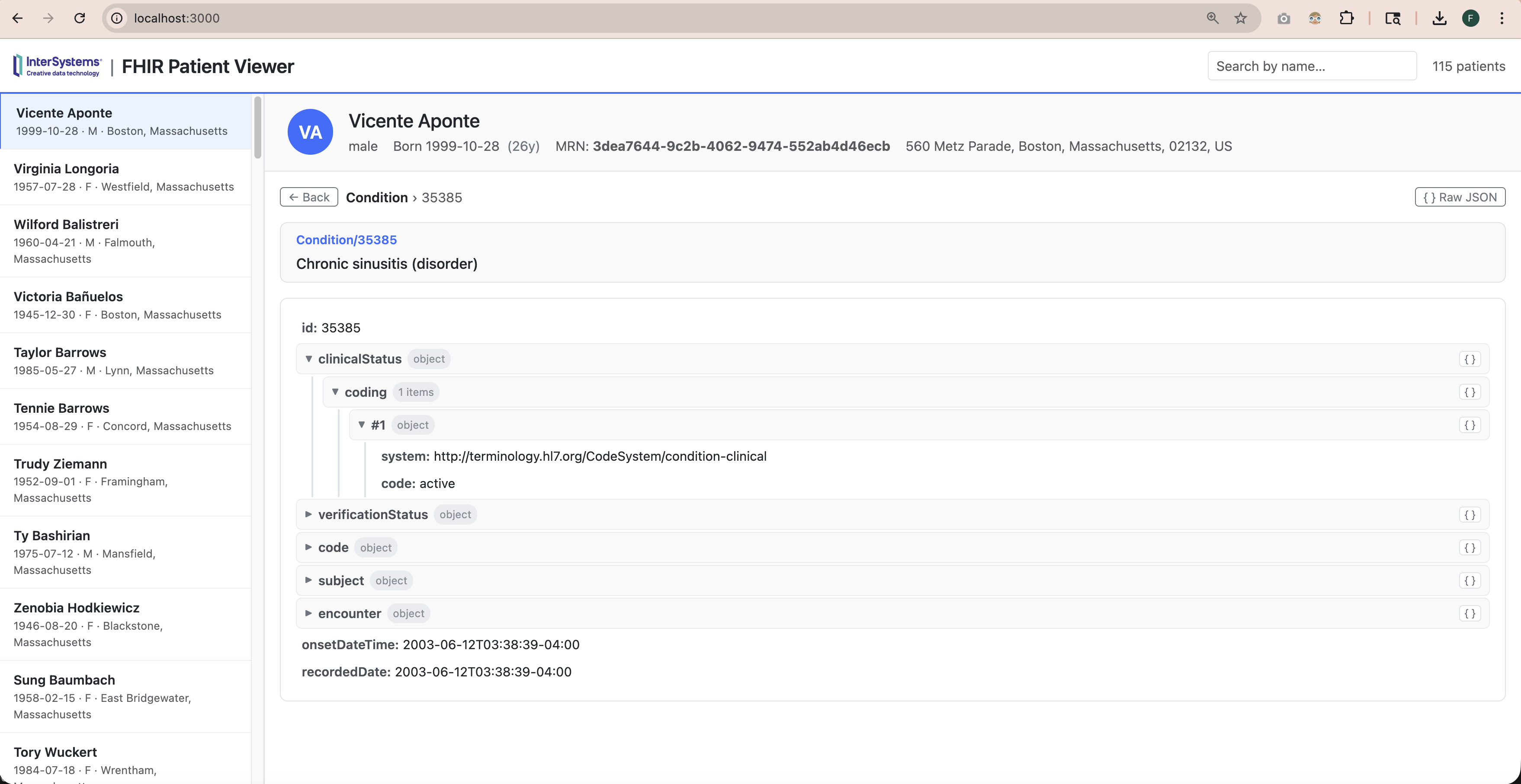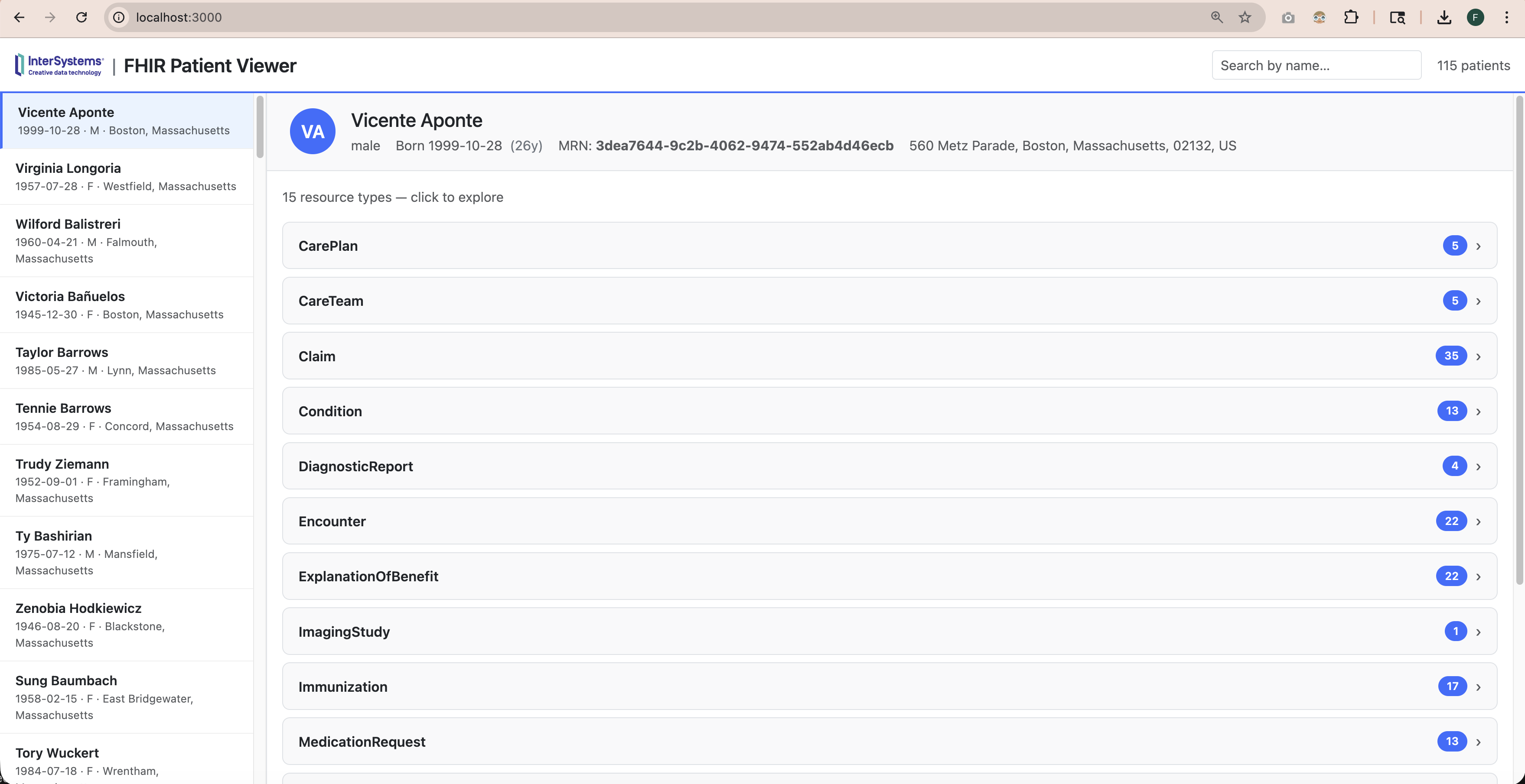 Ele já vem pré-carregado com 115 pacientes sintéticos gerados pelo Synthea